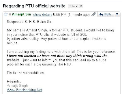 Hi Readers, Today morning I received an email regarding SQL injection vulnerability. The email was from PROHACK. Actually I have subscribed its news letter. Every thing was normal except one thing.....and that was Punjab Technical University (PTU) is hackable very easily.